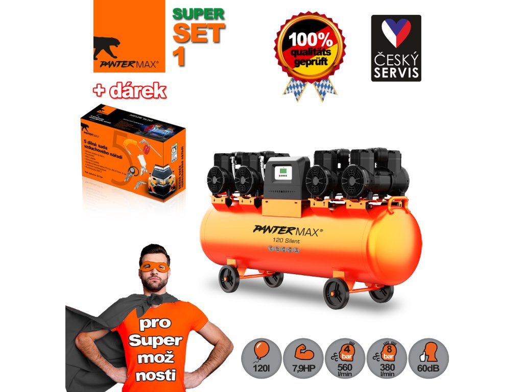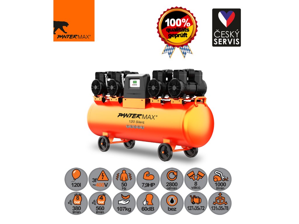 Kompresor PANTERMAX® AirFlow® 120 SILENT je veľmi tichý bezolejový osemvalcový kompresor, ktorý vyniká nízkou hlučnosťou 76dB pri zdroji (oproti priemerných viac ako 90dB pri štandardných kompresoroch). Hlučnosť 60dB (vo vzdialenosti 7m od kompresora) znamená hladinu hluku zhruba na úrovni bežnej kancelárie . Výhodou bezolejovej technológie je, že do tlakovej nádoby (vzdušníka) ani ďalej do spotrebiča vzduchu, neunikajú žiadne olejové pary.