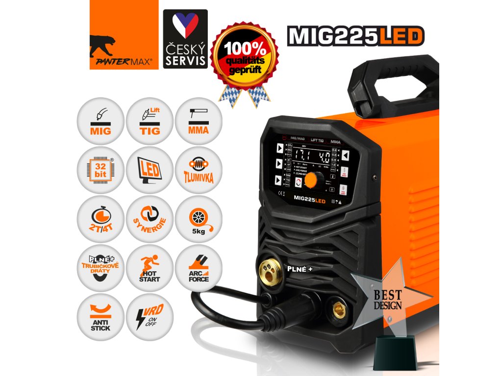 PANTERMAX® MIG225LED je synergický mikroprocesorový zvárací zdroj na zváranie metódou MIG/MAG/MMA/LiftTIG. 32-bitovým procesorom riadený IGBT invertorový zdroj a veľký LED displej umožňujú zváranie metódou MIG/MAG s použitím štandardných pevných drôtov v ochrannej plynovej atmosfére (napr. G3Si1) aj rúrkových drôtov s ochranným plynom alebo bez neho. Grafické rozhranie a synergie použité v zdroji uľahčujú jeho používanie a umožňujú, aby zdroj používali aj ľudia s minimálnymi skúsenosťami. Technológia IGBT umožňuje výrazné zníženie hmotnosti a veľkosti zdroja a zvýšenie účinnosti pri súčasnom znížení spotreby energie.