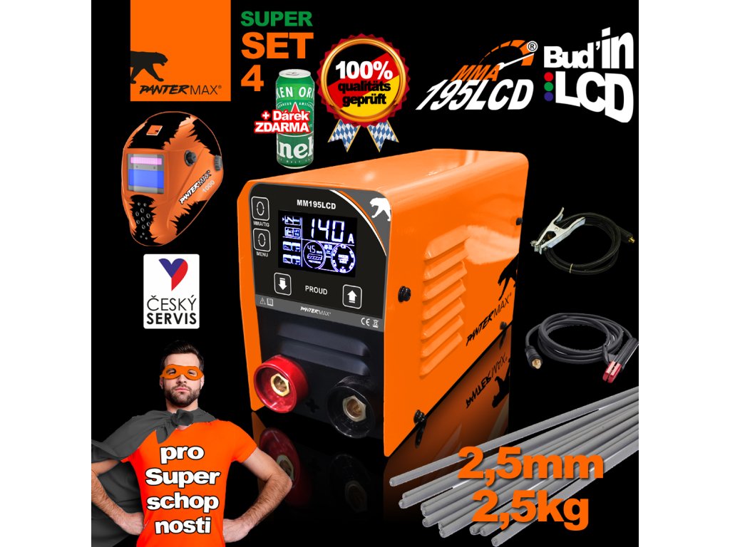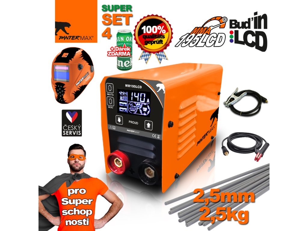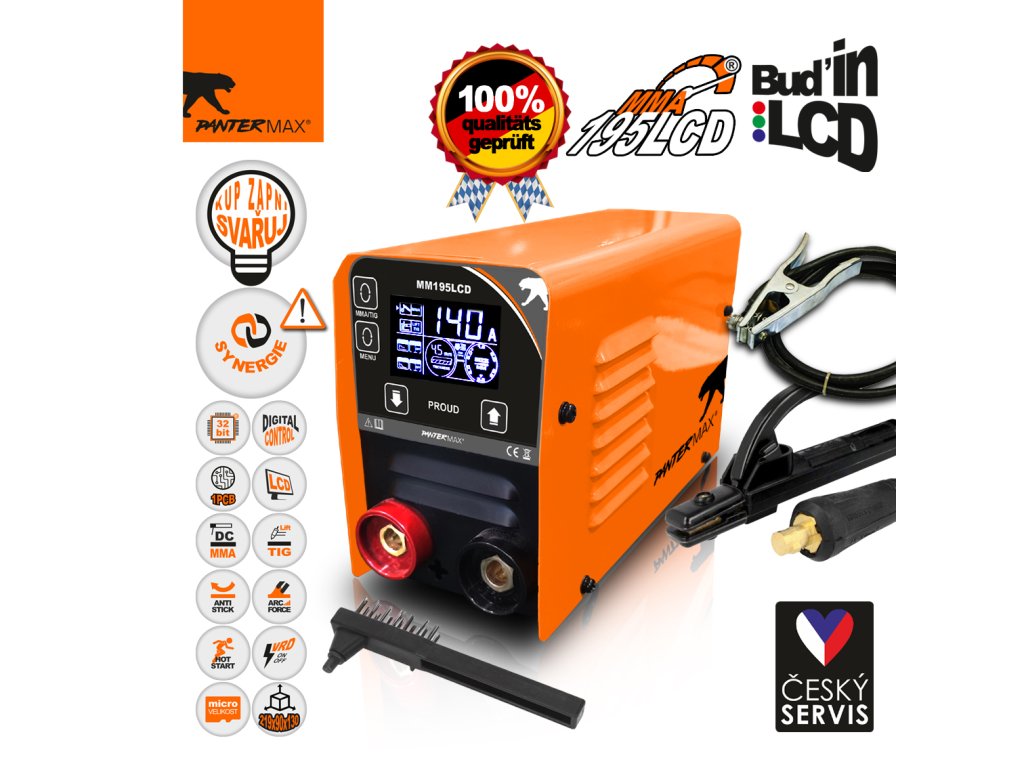 Invertorová zváračka PANTERMAX® MMA195LCD sa používa na ručné zváranie konštrukčnej ocele jednosmerným prúdom s obalenými elektródami (metóda MMA). Umožňuje tiež zváranie metódou LiftTIG. Ide o invertorový prístroj vyrobený z technologicky najvyspelejších komponentov, ktorý je vybavený technológiou IGBT. Napájací zdroj je vybavený nastaviteľnými funkciami ARC FORCE a automatickými funkciami ANTI STICK a HOT START. Má tiež funkciu VRD s možnosťou vypnutia.