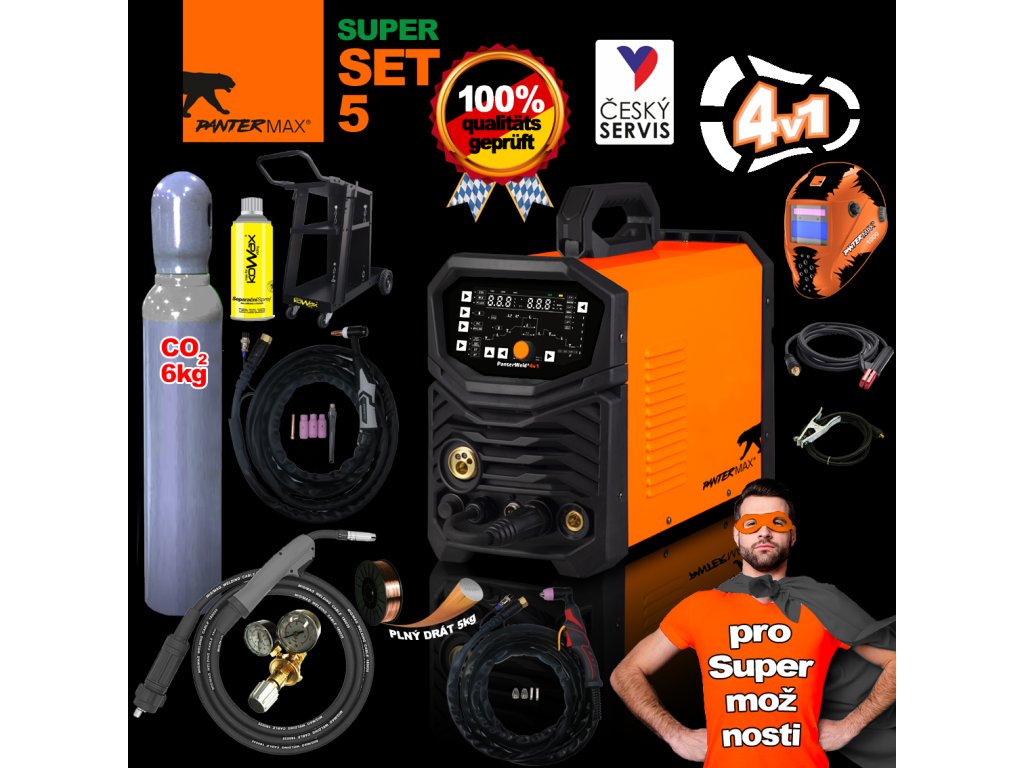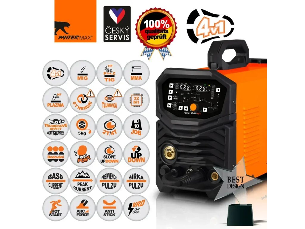 PANTERMAX® PanterWeld®4v1 je synergický mikroprocesorový zvárací zdroj na zváranie MIG/MMA/TIG + PLASMA. IGBT invertorový napájací zdroj riadený 32-bitovým procesorom a LED displejom umožňuje zváranie MIG/MAG pomocou štandardných pevných drôtov v ochrannej plynovej atmosfére (napr. G3Si1) aj rúrkových drôtov s ochranným plynom alebo bez neho. Technológia IGBT umožňuje výrazné zníženie hmotnosti a rozmerov zdroja a zvýšenie účinnosti pri súčasnom znížení spotreby energie.